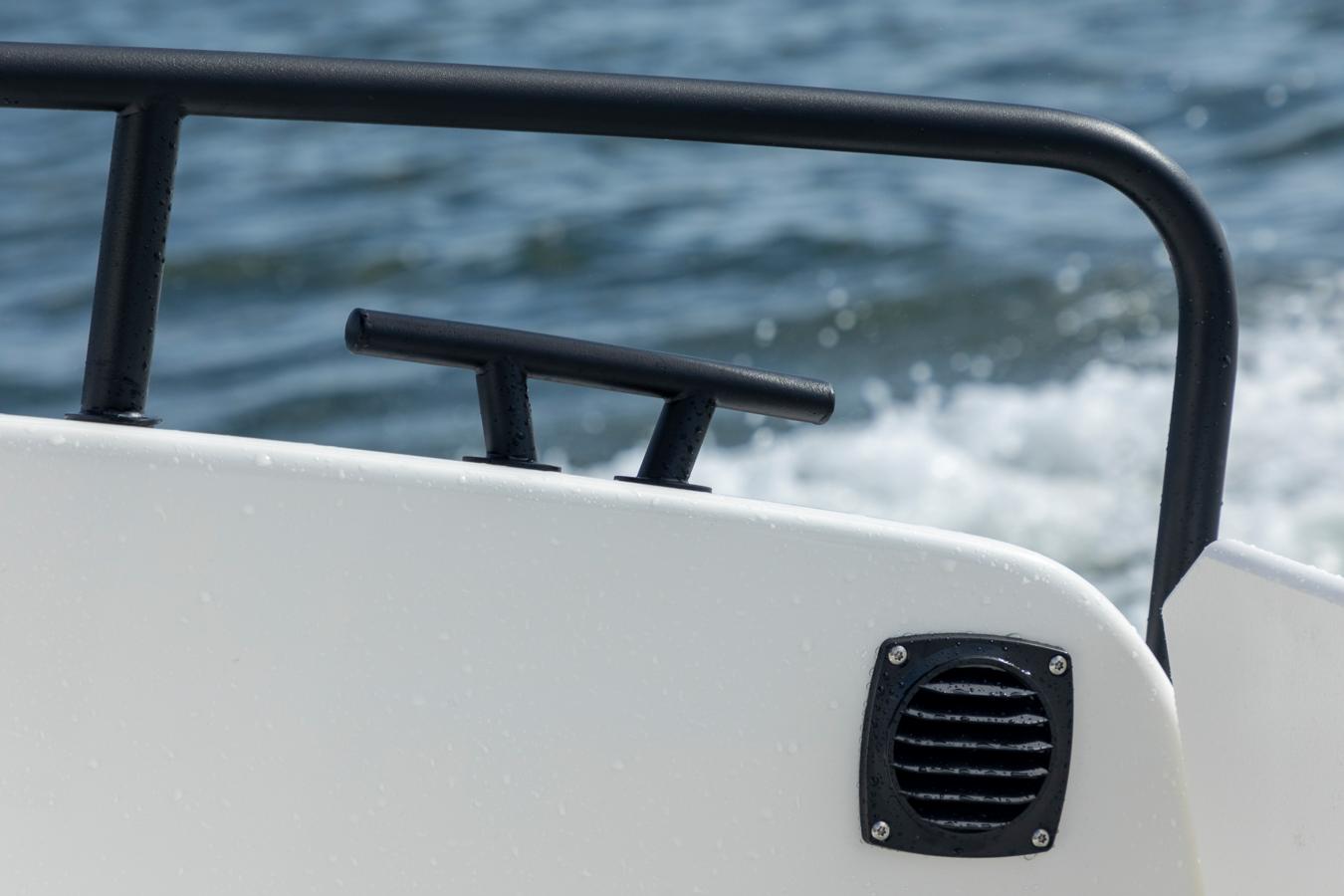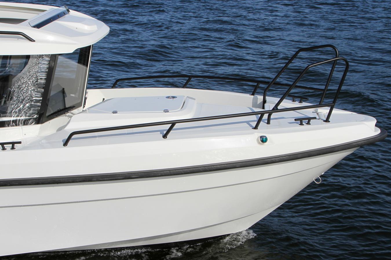 Veneen korkeat laidat, kattavat kaiteet sekä kolme askelmaa tekevät keulasta helppokulkuisen ja turvallisen.